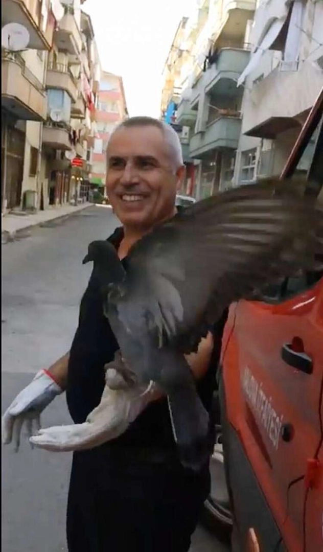 İlginç olaya Yalova İtfaiyesi tarafından kayda alındı. Bir ihbar üzerine İstiklal Caddesi üzerindeki bir apartmanın önüne gelen ekipler ayağına ip dolandığı için çatıda mahsur kalan güvercini yangın merdiveni ile uzanarak kurtardılar. Ayağına dolanan iplerden kurtarılarak aşağıya indirilen güvercin ise salıverilmesine rağmen uçmadı. İtfaiye erinin elinde durmayı sürdüren güvercin görenleri şaşkına çevirdi.