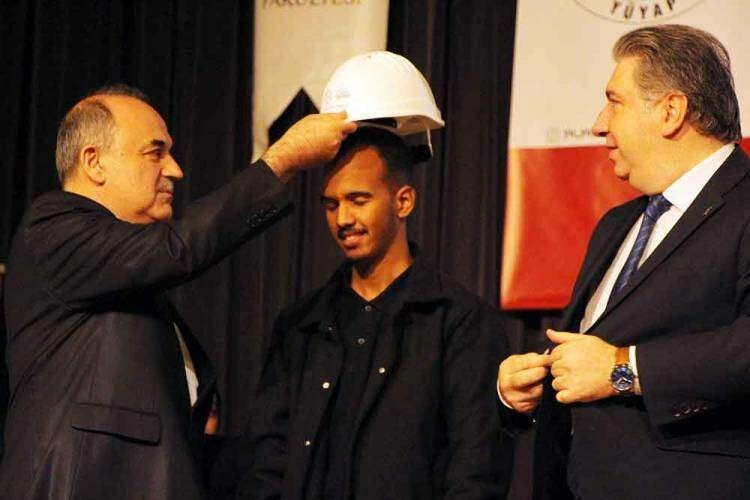 Konuşmaların ardından ise Yalova üniversitesi İnşaat Mühendisliği Bölümü öğrencileri adına başarılı öğrencilere baretlerini Yalova Valisi Muammer Erol, Yalova Üniversitesi Rektörü Prof. Dr. Mehmet Bahçekapılı, Yalova Ticaret ve Sanayi Odası Başkanı Tahsin Becan ve sektör temsilcileri birlikte taktılar.