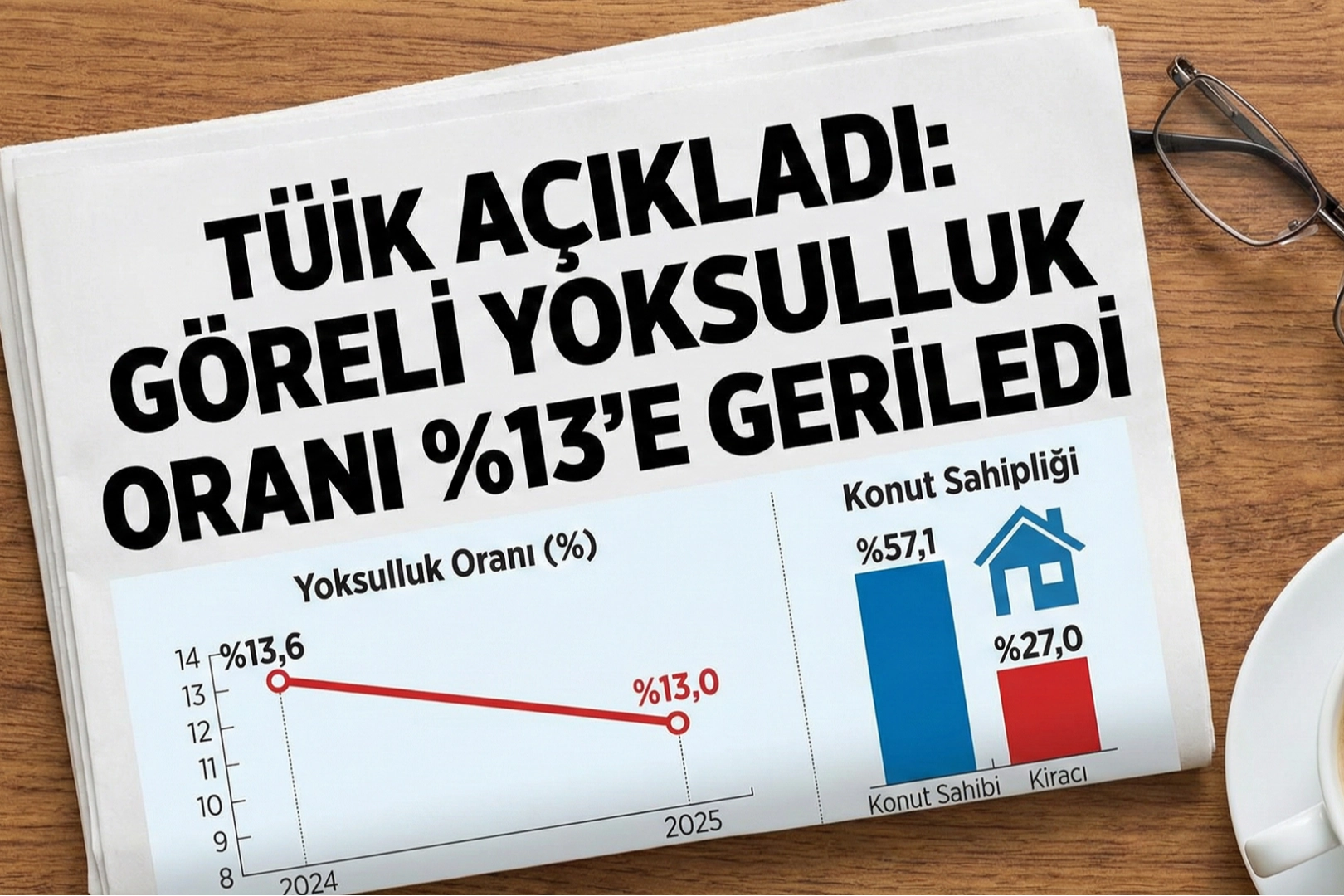 Türkiye İstatistik Kurumu (TÜİK), toplumun yaşam standartlarını ve gelir dağılımını mercek altına alan 2025 yılı Yoksulluk ve Yaşam Koşulları İstatistiklerini kamuoyu ile paylaştı. Bir önceki takvim yılı olan 2024 yılı gelirlerinin referans alındığı araştırmada, hanehalkı gelirleri, büyüklük ve kompozisyon dikkate alınarak analiz edildi. Açıklanan verilere göre, eşdeğer hanehalkı kullanılabilir fert medyan gelirinin yüzde 50'si baz alınarak belirlenen yoksulluk sınırına göre, yoksulluk oranı 2025 yılında 0,6 puan azalarak yüzde 13,0 oldu. Medyan gelirin yüzde 60'ı dikkate alındığında ise bu oran yüzde 20,6 olarak kayıtlara geçti.