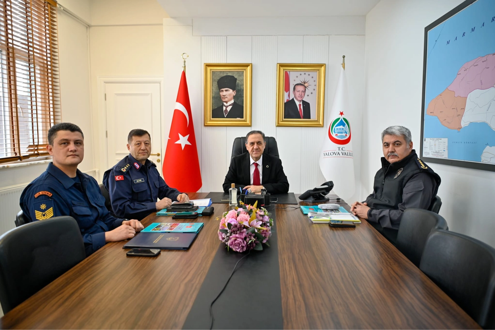 Toplantıya Vali Usta’nın yanı sıra; Yalova İl Emniyet Müdürü Yılmaz Delen, Yalova İl Jandarma Komutanı Jandarma Kıdemli Albay Ercan Altın ve Sahil Güvenlik TCSG-17 Komutanı Sahil Güvenlik Güverte Astsubay Kıdemli Üstçavuş Eren Deneri katıldı. Yalova’nın güvenlik birimlerinin en üst düzeyde temsil edildiği toplantıda, bayram süresince emniyet, jandarma ve sahil güvenlik ekiplerinin sahada yürüteceği koordineli çalışmalar planlandı. Vatandaşların huzur ve güven içerisinde bir tatil geçirmesi için tüm birimlerin teyakkuzda olacağı vurgulandı.