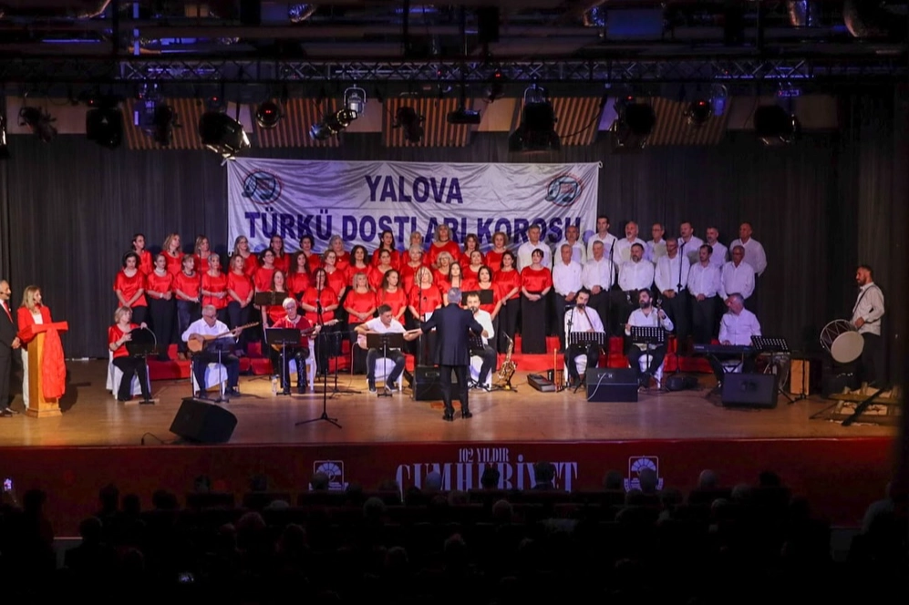 Cumhuriyetin 102. yılı dolayısıyla Yalova’da düzenlenen kutlama etkinlikleri kapsamında Raif Dinçkök Kültür Merkezi’nde sanat dolu bir gece yaşandı. Yalova Türkü Dostları Korosu tarafından gerçekleştirilen konserde, Ulu Önder Mustafa Kemal Atatürk’ün sevdiği şarkılar birbiri ardına seslendirildi. Salonu dolduran çok sayıda vatandaş, ellerindeki Türk bayraklarıyla Cumhuriyet coşkusunu salona taşıdı. Zeybek gösterisi ise geceye damgasını vurarak izleyicilerden büyük alkış aldı.