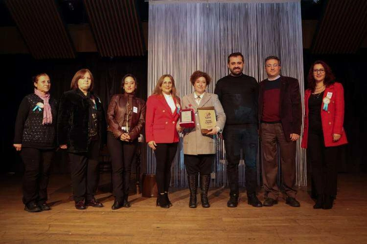 Dakikalarca alkışlanan tiyatro gösterisinin sonunda Yalova Belediyesi Kültür ve Sosyal İşler Müdürü Candan Yılmaz ve Yalova Kent Konseyi Kadın Meclisi Başkanı Fadime Yıldırım Karoğlu, Usta oyuncu Sevtap Çapan’a plaket ve çiçek takdiminde bulundu.