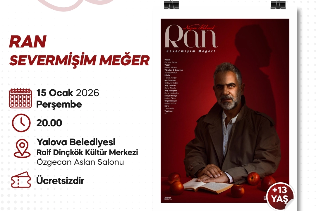 Nazım Hikmet Ran’ın ebediyete intikalinin 61. yılı anısına sahnelenecek olan “RAN – Severmişim Meğer” adlı tiyatro oyunu, 15 Ocak Perşembe akşamı saat 20.00’de Raif Dinçkök Kültür Merkezi Özgecan Aslan Salonu’nda izleyiciyle buluşacak. Etimesgut Belediyesi ev sahipliğinde sahnelenen ve Entropi Sahne yapımı olan oyunda, usta oyuncu Yurdaer Okur hem yönetmen hem de oyuncu olarak sahne alıyor. Nazım Hikmet’in şiirleri ve mektuplarından sahneye uyarlanarak, şairin sürgünlerle, aşkla ve memleket özlemiyle örülü yaşamını güçlü bir anlatımla tiyatro sahnesine taşıyor.