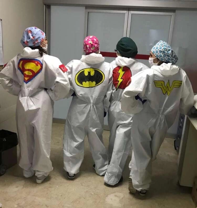 Tulumlarına süper kahraman armaları çizen sağlıkçılar çizdikleri tablo ile de korona virüsü nasıl yendiklerini resmettiler.