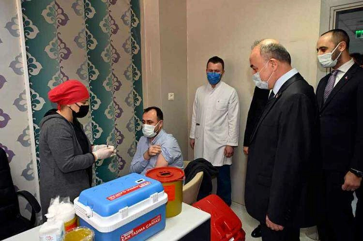 Hastanenin aşı odasındaki vatandaşlarla sohbet eden Vali Erol, kentte Turkovac’ın ilk uygulandığı vatandaşlardan Halil Ulusoy’u tebrik ederek, aşının hayırlı olmasını diledi.