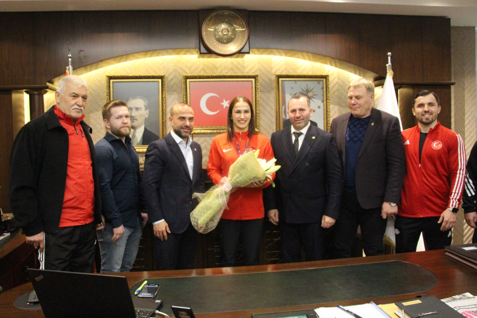 Ziyarette hazır bulunan AK Parti İl Başkanı Umut Güçlü de başarılı sporcuyu tebrik etti.