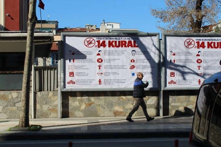 Korona Virüs ile mücadele her alanda devam ediyor. Bu kapsamda Sağlık Bakanlığı tarafından belirlenen 14 altın kural vatandaşlara hatırlatılmak üzere billboardlarda sergilenmeye başlandı. Vatandaşlardan bu kurallara uyulması isteniyor. İşte bakanlığın belirttiği kurallar; Ellerinizi sık sık su ve sabun ile en az 20 saniye boyunca ovarak yıkayın. Soğuk algınlığı belirtileri gösteren kişilerle aranıza en az 3-4 adım mesafe koyun. Bulunduğunuz ortamları sık sık havalandırın. Kıyafetlerinizi 60-90 derece normal deterjanla yıkayın. Ateş, öksürük, nefes darlığı gibi şikâyetleriniz varsa, maske takarak bir sağlık kuruluşuna başvurun. Öksürme ve hapşırma arasında ağız ve burunu tek kullanımlık mendille kapatın, mendil yoksa dirseğin iç kısmını kullanın. Yurtdışı seyahatlerinizi iptal edin ya da erteleyin. Kapı kolları, armatürler, lavabolar gibi sık kullandığınız yüzeyleri su ve detarjanla her gün temizleyin. Tokalaşma, sarılma gibi yakın temaslardan kaçının. Soğuk algınlığı belirtileriniz varsa yaşlılar ve kronik hastalarla temas etmeyin, maske takmadan dışarı çıkmayın. Ellerinizle gözlerinize, ağzınıza ve burnunuza dokunmayın. Yurt dışından dönüşte ilk 14 günü evinizde geçirin. Hiçbir kişisel eşyanızı (havlu gibi gündelik eşyaları) ortak kullanmayın. Bol sıvı tüketin, dengeli beslenin, uyku düzeninize dikkat edin.