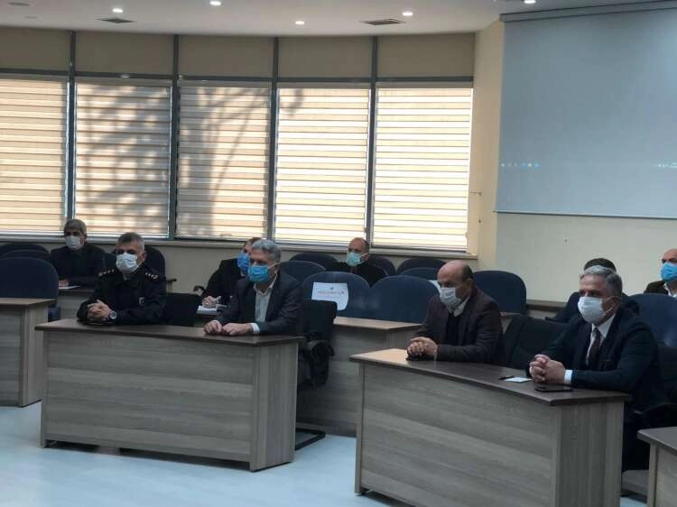 Yalova Valisi Muammer Erol’un başkanlık ettiği “Covid-19 salgını ile mücadele, denetlemeler ve tedbirler” konulu toplantı İl Özel İdaresi Toplantı Salonu’nda gerçekleştirildi. Toplantıda; yayınlanan genelge ile alınması istenen tedbirler, getirilen kısıtlamalar ve bunların uygulanması konularında görüş alışverişinde bulunuldu. İlgili kurumlar da toplantıda bilgiler verdi. Pazar yerlerinde, toplu taşımada HES kodların sorgulanması ve işyerlerinin denetlenmesi gibi noktalar da masaya yatırıldı. Toplantıya Termal Belediye Başkanı H. Sinan Acar da katıldı. Acar diğer belediye başkanları, İl Emniyet ve Jandarma Komutanı ile kurum müdürleri ile de görüş alışverişinde bulundu.