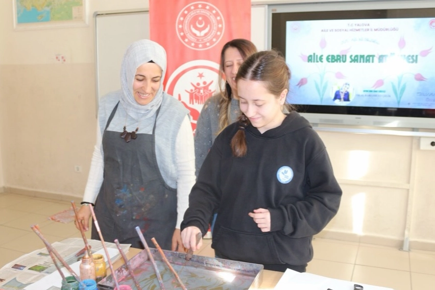 Yalova Aile ve Sosyal Hizmetler İl Müdürlüğü, 2025 Aile Yılı kapsamında düzenlediği etkinliklere hız kesmeden devam ediyor. Müdürlük, kültürel değerlerin yaşatılması ve kuşaklar arası bağın güçlendirilmesi amacıyla Yalova Prof. Dr. Necmettin Erbakan Sosyal Bilimler Lisesi öğrencileri ve velilerine yönelik özel bir program gerçekleştirdi. Düzenlenen "Aile Ebru Sanat Atölyesi", Ebru sanatçısı Hilal Karaaslan Çelik rehberliğinde hayata geçirildi. Atölye çalışmasında bir araya gelen öğrenci ve veliler, suyun üzerindeki renklerin ahengine tanıklık ederek geleneksel Türk ebru sanatını uygulamalı olarak deneyimleme fırsatı buldu. Renkli görüntülerin oluştuğu ve katılımcıların keyifli vakit geçirdiği etkinliğin sonunda yetkililer, emeği geçen eğitimcilere ve programa ilgi gösteren katılımcılara teşekkür etti.