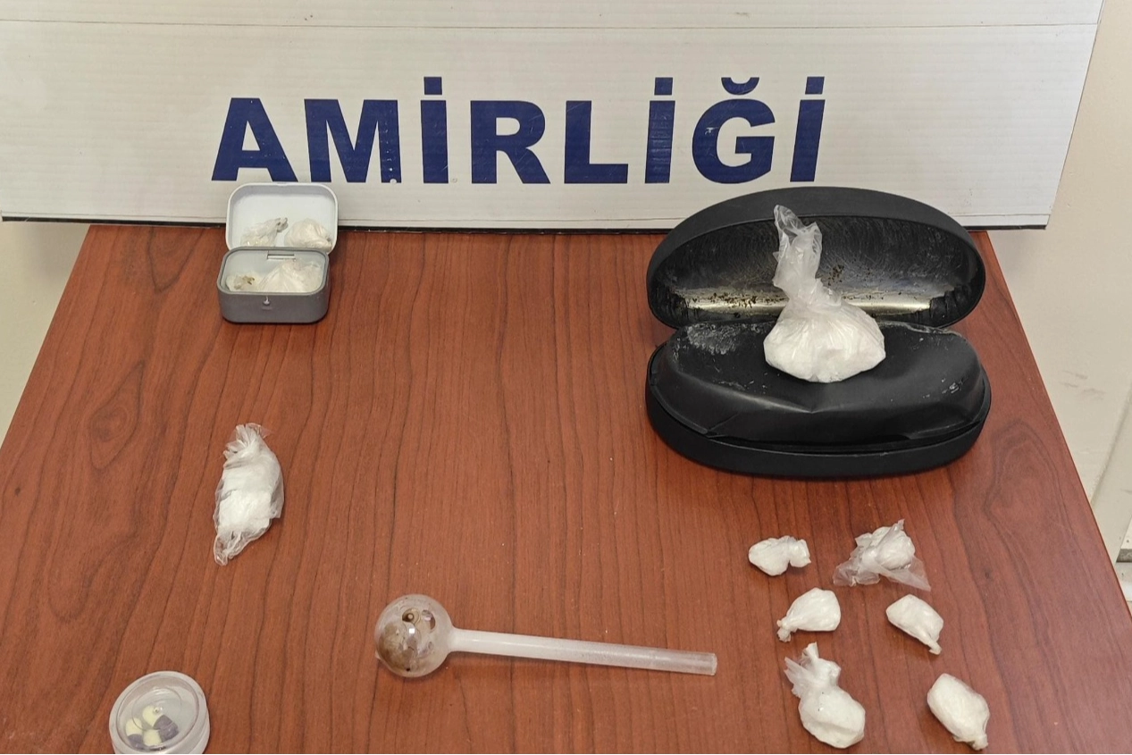 Şüphelinin üzerinde yapılan aramada: 11 parça halinde toplam 41,86 gram metamfetamin, 1,21 gram sentetik kannabinoid, 3 adet sentetik ecza (lyrica), 1 adet cam uyuşturucu aparatı ve 1 adet hassas terazi bulundu.