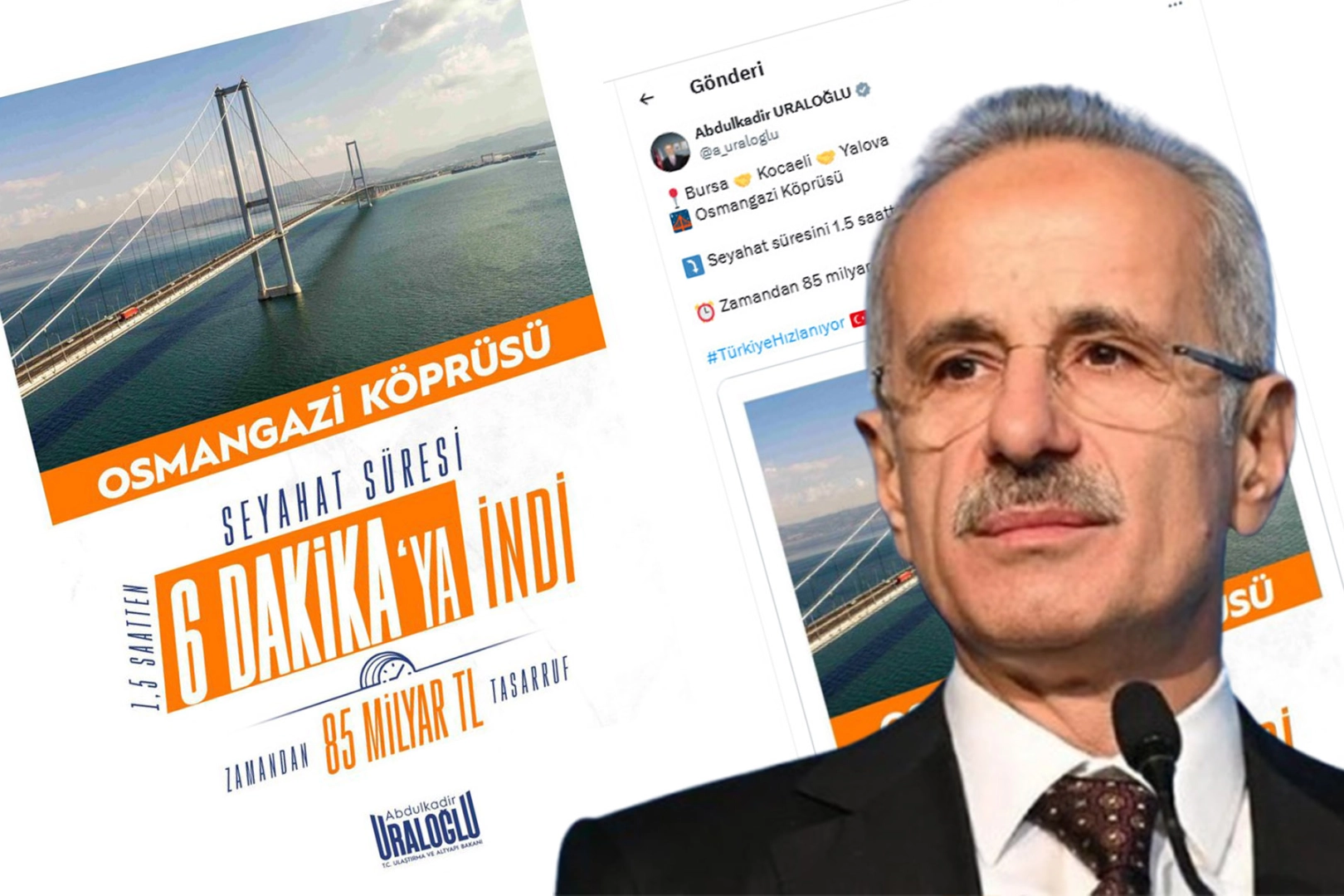 Ulaştırma ve Altyapı Bakanı Abdülkadir Uraloğlu, sosyal medya hesabı üzerinden Yalova’yı da etiketleyerek Osmangazi Köprüsü’ne ilişkin bir paylaşım yaptı. Bakan Uraloğlu, paylaşımında, Kocaeli ile Yalova arasındaki kara yolu ulaşımının Körfez'i dolanarak yaklaşık 1,5 saat sürdüğünü, Osmangazi Köprüsü sayesinde bu sürenin sadece 6 dakikaya indiğini ifade etti.