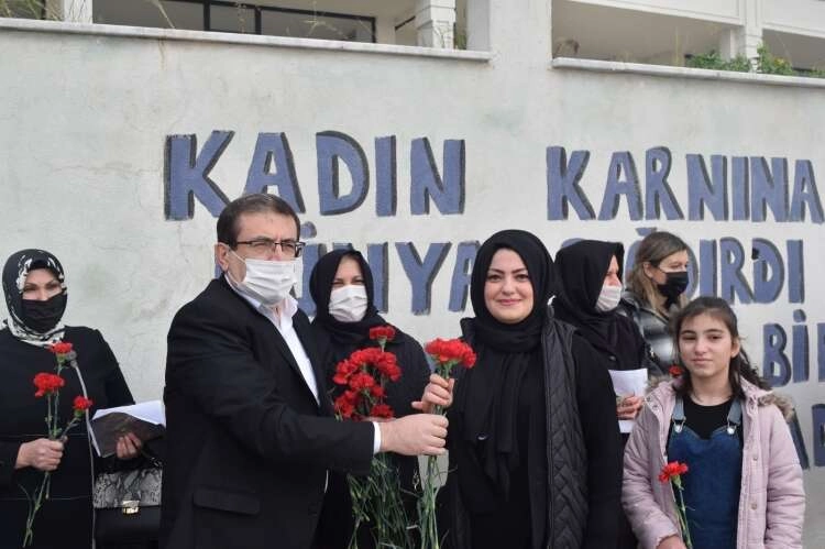 Kadınlara destek veren başkan Tokat, çiçek sunmayı da ihmal etmedi.