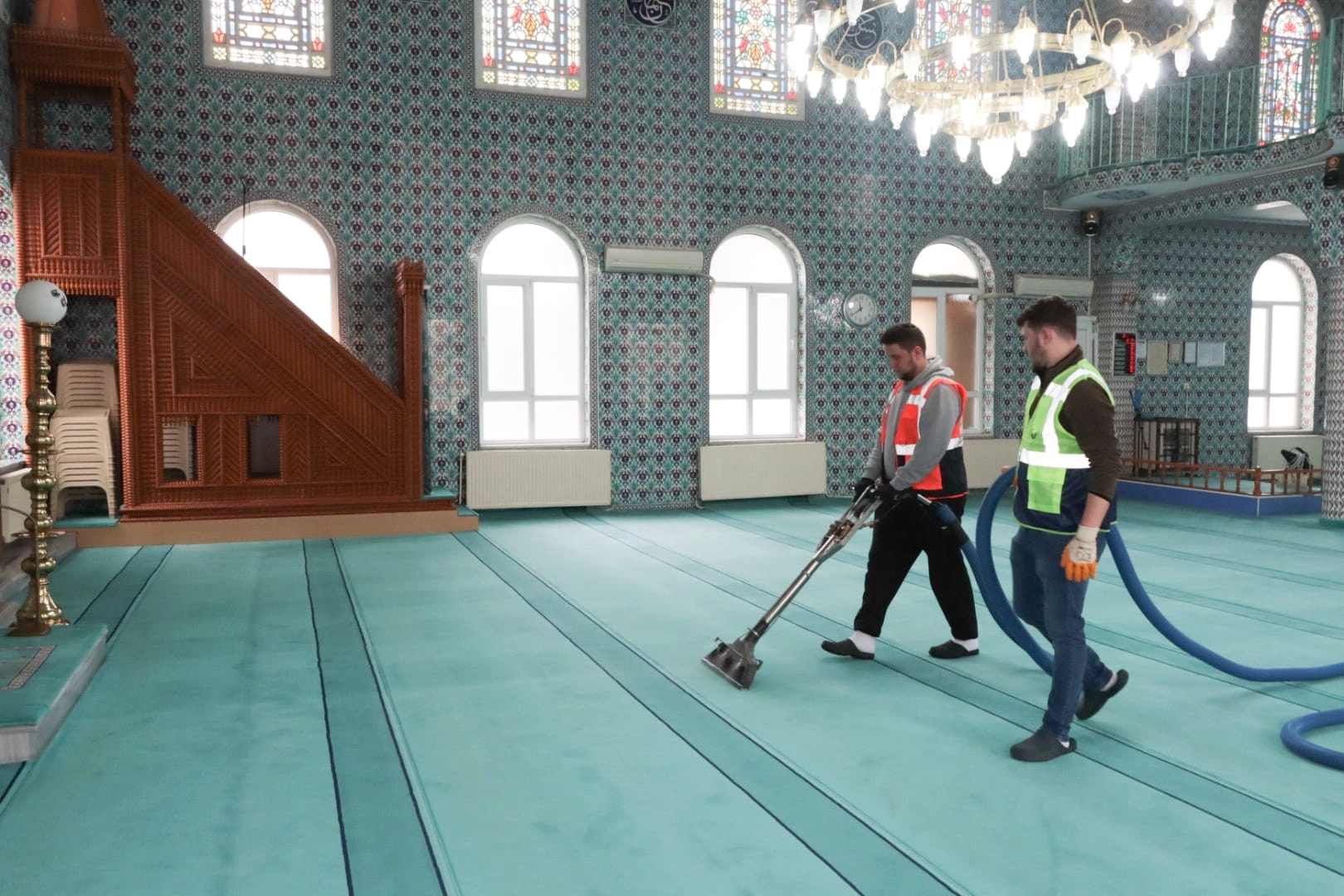 Temizlik çalışmaları kapsamında cami ve mescitlerin iç mekânları detaylı şekilde hijyenik hale getirilirken; halılar süpürülüp yıkanıyor, mihrap, minber ve kürsüler özenle siliniyor. Ayrıca kapı, pencere, ayakkabılık ve ortak kullanım alanlarında da dezenfeksiyon işlemleri uygulanıyor.