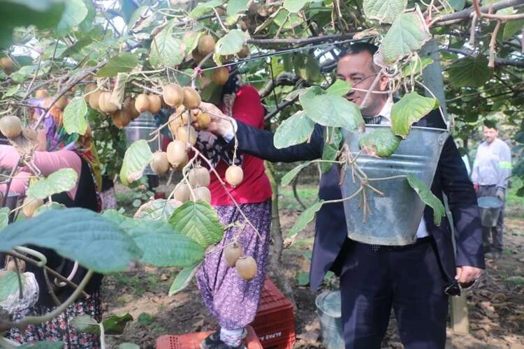 Çiftçilere hayırlı işler dileyen Canbay bir süre onlarla birlikte Kivi toplamayı da ihmal etmedi.