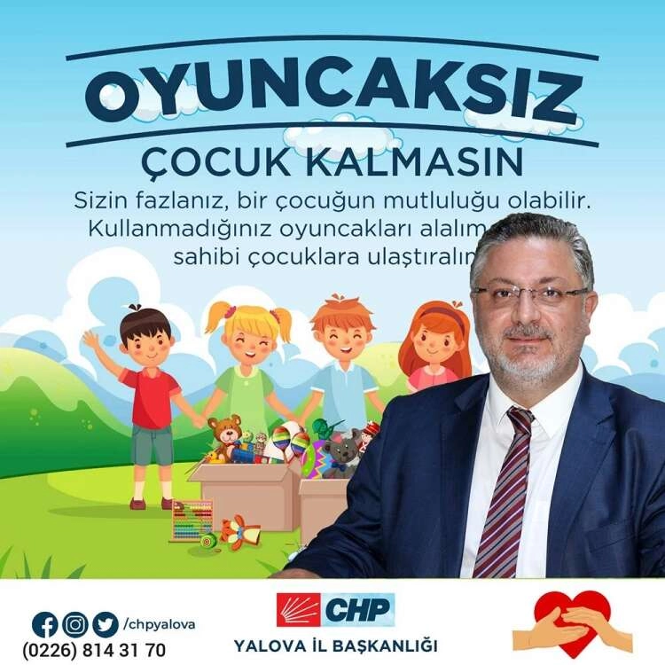 CHP tarafından hayata geçirilen “Oyuncaksız Çocuk Kalması” kampanyasını CHP Yalova İl Başkanı Mehmet Gürel tanıttı. Konuyla ilgili yazılı bir açıklamada bulunan Gürel tüm Yalovalıları bu kampanyaya desteğe davet etti. Gürel açıklamasında şu detaylara yer verdi, “Ekonomik açıdan giderek daha da kötüye gittiğimiz bu günlerde evine ekmek götürmekte zorlanan milyonlarca vatandaşımızın olduğunu üzülerek gözlemliyoruz. Ne yazık ki işsizlik oranları her gün yeni rekorlar kırıyor, esnaf perişan insanlar mutsuz ve umutsuz. Bu ulusal ekonomik buhran sürecinde Cumhuriyet Halk Partisi Yalova Örgütü olarak maddi imkanı yeterli olmayan ebeveynler çocuklarına oyuncak hediye verebilsin diye bir çalışma başlatıyoruz. Birçoğumuzun evinde kullanılmayan oyuncaklar var. Partimizle irtibat kuran yardımsever vatandaşlarımızın evlerinde artık kullanmadıkları oyuncakları toplayıp, hijyenik bir şekilde yaş ve cinsiyet gruplarına göre ayrıştırıp, paketleyip, ‘Yalova Halkının Hediyesi’ olarak maddi imkanı yetersiz anne babalara ulaştıracağız. Böylelikle onlar da bu oyuncakları evlatlarına hediye olarak verebilecekler. Gelin hep beraber bu zor günlerde yardımseverliğimizi gösterelim. Unutmayın, sizin çocuklarınızın kullanmadığı bir oyuncak başka bir çocuğun mutluluğu olabilir”