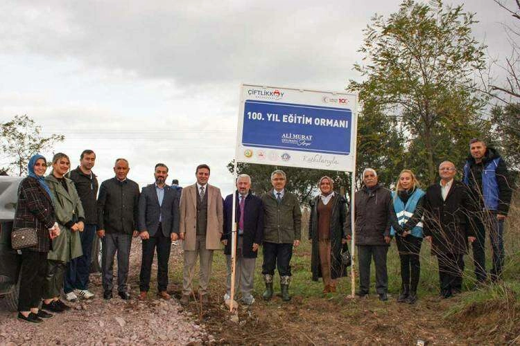 500 Evler Mahallesi’nde oluşturulan 100.Yıl Eğitim Hatıra Ormanı için gerçekleştirilen fidan dikimine Çiftlikköy Kaymakamı Ömer Bilgin’in yanı sıra Çiftlikköy Belediye Başkan Vekili Hamit Akbulak, İlçe Milli Eğitim Müdürü Muhammet Beşir, ilçedeki kamu kurum ve kuruluşlarının müdürleri ile öğrenciler de eşlik etti. Çiftlikköy Belediyesi, Çiftlikköy Kaymakamlığı, İlçe Milli Eğitim Müdürlüğü ve Orman İşletme Müdürlüğü’nün katkılarıyla yapılan etkinlikte, Orman İşletme Müdürlüğü’nden temin edilen defne ve fıstık çamları toprakla buluştu. Çiftlikköy Şehit Abdulhamit Kaya Ortaokulu, Şehit Talha Bahadır Ortaokulu, Şehit Ömer Halisdemir Ortaokulu ve Mehmet Akif İnan Ortaokulu’ndan 100 gönüllü öğrencinin katıldığı etkinliğin sonunda katılımcılar hatıra fotoğrafı çekildi.