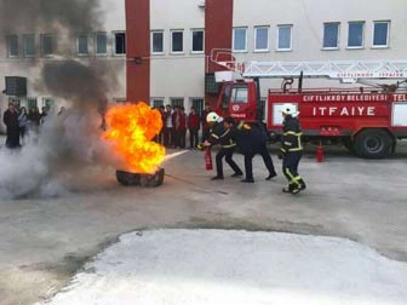 Okulda İtfaiye Amiri Süleyman Caner Çark tarafından öğrencilere verilen teorik yangın eğitiminin ardından okul bahçesinde yangın söndürme tatbikatı yapıldı. Alev koruyan elbiseleri giyen öğrenciler, Çiftlikköy Belediyesi İtfaiye Ekiplerinin nezaretinde oluşturulan suni yangını, yangın tüpleriyle müdahale ederek başarıyla söndürdü. Eğitim ve tatbikatın başarılı geçtiğini belirten itfaiye yetkilileri, öğrencilere tam puan verdiklerini belirtti. Bu yıl 6’ncı kez yangın eğitimi gerçekleştirdiklerini belirten Çiftlikköy Belediyesi İtfaiye Müdürlüğü yetkilileri, “Geçtiğimiz yıl 30’u aşkın okul, işyeri ve fabrikada teorik ve uygulamalı olarak yangın eğitimi ve yangın söndürme tatbikatı gerçekleştirdik. Bu yıl da okulumuzdan gelen talep üzerine verdiğimiz bu eğitim, 2016’nın 6’ncı eğitimi oldu ve başarılı bir tatbikatla sonuçlandırdık. Bize gelen taleplerin hemen hepsini değerlendirerek gerekli eğitimleri veriyoruz” diye bilgi verdi. Teorik eğitimde öğrencilere yanma nedir, yangın nedir, yangın söndürme usulleri, yangın anında doğru hareket tarzı gibi bilgilerin verildiğini kaydeden yetkililer, uygulamalı tatbikatta ise yangın söndürme cihazının kullanımı, özellikleri ve yangın anında nasıl söndürme yapılacağını anlattıklarını dile getirdi. Çiftlikköy Atatürk Anadolu Lisesi’nde verilen eğitim, 1-7 Mart Sivil Savunma Haftası dolayısıyla gerçekleştirildi.