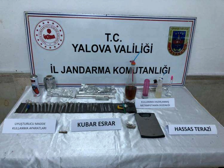 Yalova Jandarma Komutanlığı ekipleri uyuşturucuya göz açtırmıyor. Yapılan denetimler ve çalışmaların yanısıra alınan istihbaratı da değerlendiren ekipler uyuşturucu tacirlerine ağır darbeler indiriyor. Bu kapsamda alınan bir istihbarattan yola çıkan Yalova jandarma Komutanlığı ekipleri Çınarcık ilçesi Koru beldesinde bir eve operasyon gerçekleştirdiler. Evde yapılan aramada 21 gram Kubar Esrar, 27 adet uyuşturucu içme aparatı, 1 adet hassas terazi ve içerisinde metanfetamin olduğu değerlendirilen 800 ml sıvı madde ele geçirildi. Olayla ilgili A.G.(33) ve D.Y (41) adında biri kadın iki şahıs da gözaltına alındı.
