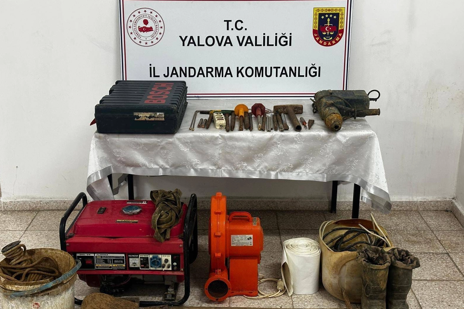Yalova İl Jandarma Komutanlığı ekiplerince Çınarcık ilçesinde gerçekleştirilen devriye faaliyeti sırasında, ormanlık alanda izinsiz kazı yapan 3 şüpheli suçüstü yakalandı. Kazı alanında yapılan incelemede, define aramak amacıyla kullanıldığı değerlendirilen 1 adet benzinli jeneratör, 1 adet elektrikli hilti, 1 adet elektrikli havalandırma fanı ve 24 parça çeşitli kazı malzemesi ele geçirildi.