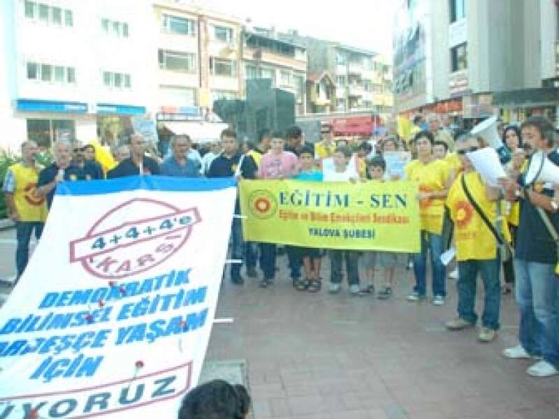 Uğur Mumcu Kültür Merkezi önünde bir araya gelen sendika üyeleri, 4+4+4 eğitim sistemini protesto ettiklerini belirttiler. Bunun için 15 Eylül’de Ankara’da yapılacak eyleme katılacaklarını söyleyen Eğitim Sen Merkez Disiplin Kurulu Üyesi Mehmet Sarı, herkesi bilimsel gerçekleri savunmaya davet ettiklerini belirtti.Sendika üyeleri “Gerici, ırkçı eğitime hayır”, “Eğitim hakkı satılamaz”, “Susma sustukça sıra sana gelecek” şeklinde slogan attı. Sendika üyeleri adına açıklama yapan Mehmet Sarı, “AK Partinin siyasal ve ideolojik hedefleri doğrultusunda hazırlanan ve yasalaşan 4+4+4 kademeli eğitim düzenlemesi, başta okula başlama yaşı olmak üzere pek çok yönden sorunlu bir şekilde uygulanmaya başlandı. 4+4+4 dayatması nedeniyle yeni eğitim ve öğretim yılı büyük bir kaosa açılacaktır. Henüz oyun çağında bulunan 60-72 aylık çocukların, temel eğitim açısından son derece önemli olan okul öncesi eğitim almadan ilkokula gönderilmesindeki ısrar çocuklarımıza yapılmış en büyük kötülüktür” şeklinde konuştu.Yapılan açıklamanın ardından sendika üyeleri Ankara’ya doğru yola koyuldu.