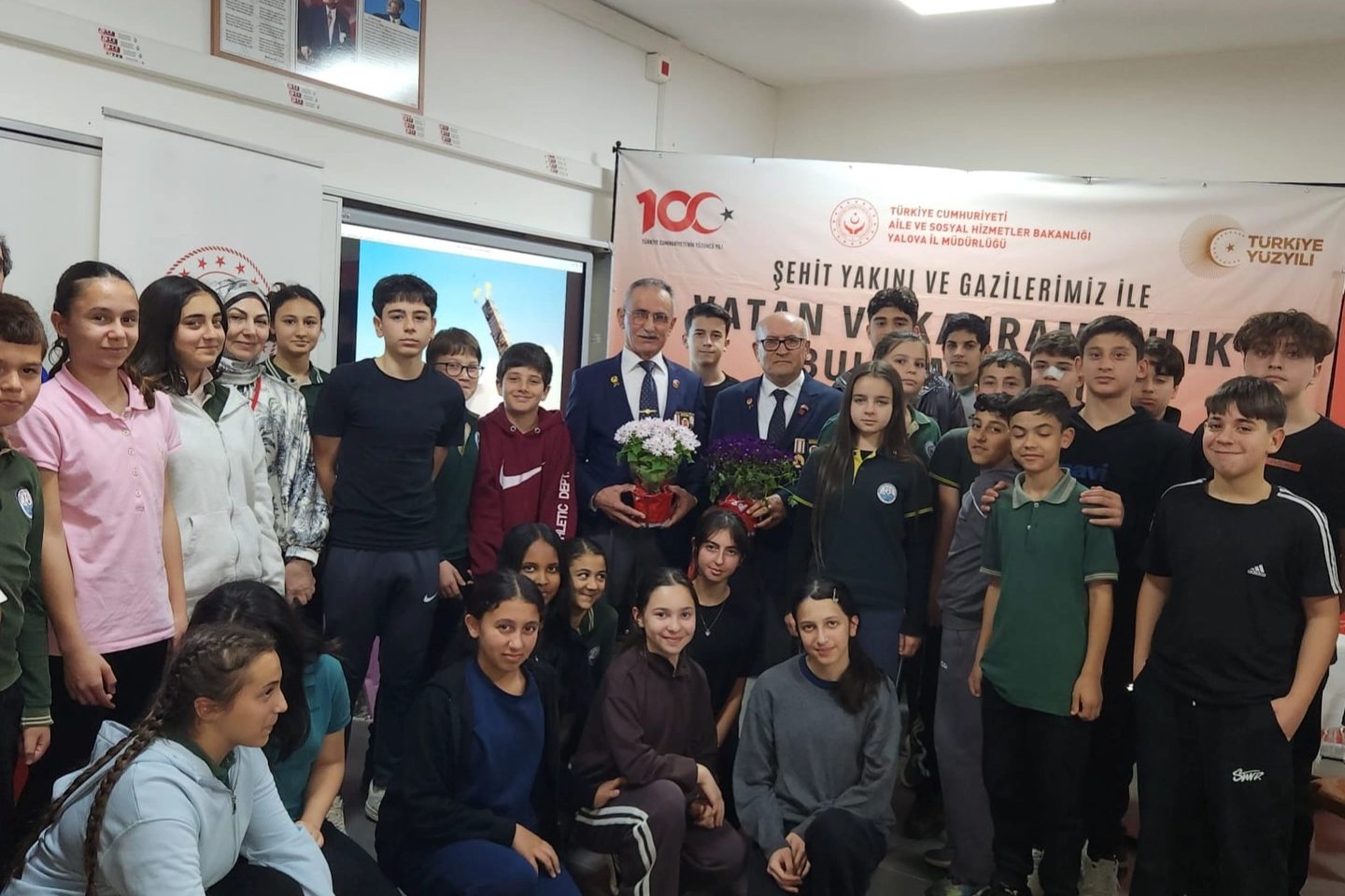 Aile ve Sosyal Hizmetler Bakanlığı ile şehit ve gazi dernekleri iş birliğinde yürütülen “Vatan ve Kahramanlık Buluşmaları” projesi, Yalova’da genç kuşaklarla kahraman gazileri buluşturmaya devam ediyor. Bu kapsamda organize edilen etkinliklerin son durağı, Samanlı Ortaokulu oldu.