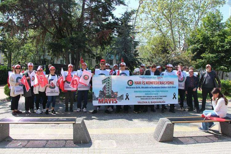 1 Mayıs İşçi ve Emekçiler Bayramı nedeni ile Cevdet Aydın Parkı’nda toplanan Hak-İş sendikası üyeleri bir basın açıklaması yaptı. Hak-İş Yalova Temsilcisi Nebi Karagöz, sendika üyelerinin ellerinde pankartlarla hazır bulunduğu açıklamada, 1 Mayıs’ın işçi sınıfının birlik, mücadele ve dayanışma günü olduğunu belirtti. Karagöz, “Pandemi sebebiyle ara vermek durumunda kaldığımız kitlesel 1 Mayıs programlarımızı, bugün burada, siz kıymetli emekçilerimizle deprem dayanışmamız sebebiyle başlatmış oluyoruz. HAK-İŞ olarak; sağlığımız, işimiz, ekmeğimiz, güvenli ve güvenceli istihdam, refah dolu yarınlar ve güçlü gelecek için taleplerimizi yine meydanlardan yüksek sesle haykırıyoruz.” dedi.