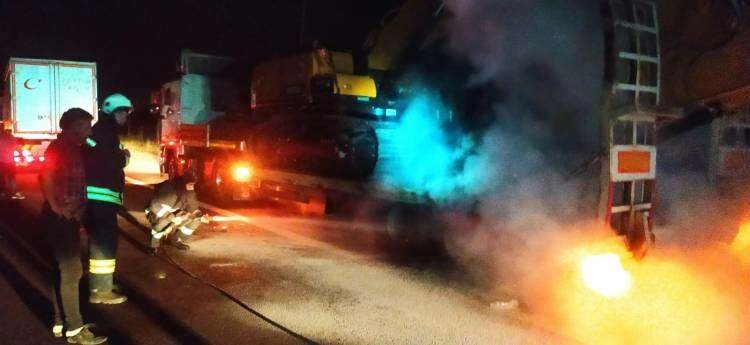 Alınan bilgiye göre, İstanbul İzmir Otoyolu kılıç mevkiinde seyir halindeki 41 AGU 194 plakalı tırın dorse lastiklerinde yangın çıktı. İş makinası yüklü tırda çıkan yangına kısa sürede müdahale eden Altınova Belediyesi İtfaiye Amirliği ekipleri, alevleri daha da büyümeden kontrol altına alarak söndürdü.