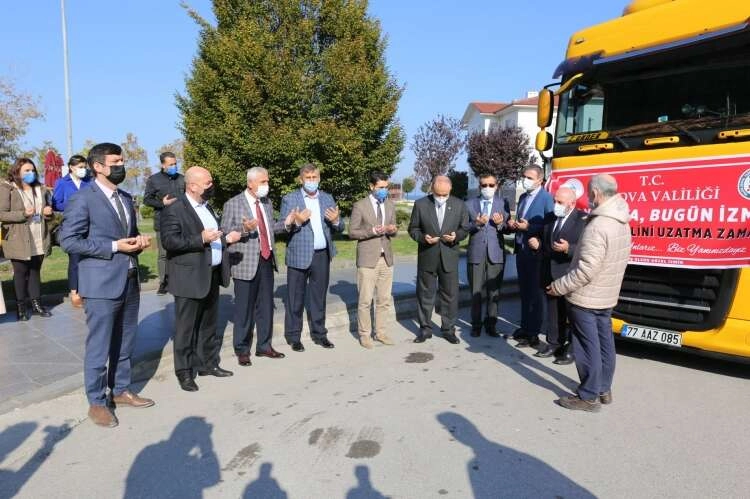 Vali Erol’un konuşması sonrasında Yalova Müftüsü Cevdet Cemal Çıkrık tarafından edilen dualar eşliğinde yardım TIR’ı İzmir’e hareket etti.