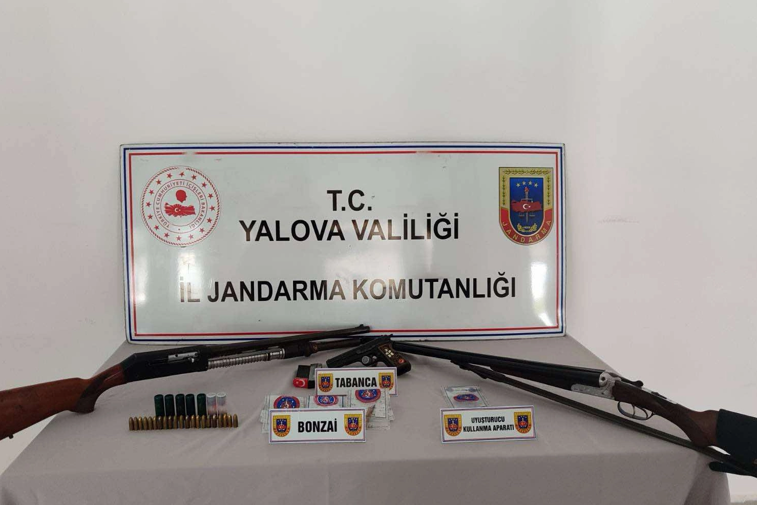 Yalova İl Jandarma Komutanlığı’ndan yapılan açıklamaya göre, istihbari çalışmalar neticesinde, Termal ilçesi Akköy köyünde U.A. adlı şahsın evinde uyuşturucu madde ve F.A. adlı şahsın evinde de ruhsatsız silah bulundurduğu bilgisine ulaşıldı.