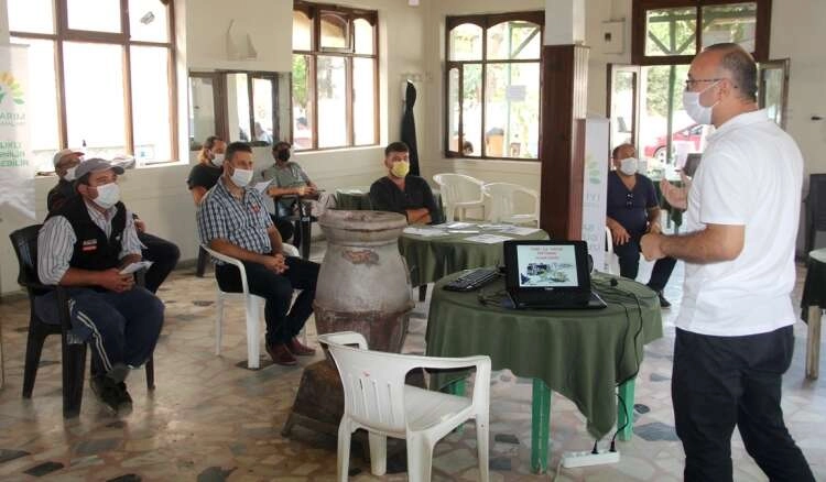 Kocadere’deki eğitime 8 üretici katıldı. Pandemi nedeniyle katılımcı sayısı az tutulan eğitimde pandemi kurallarına riayet edildi ve her üreticinin ateşi ölçülerek maske ve mesafe kurallarına uyuldu. Toplantı mekanı girişinde de el dezenfektanı bulundurularak içeri girişlerde kullandırıldı.
