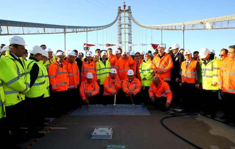 Devletin zirvesi Türkiye'nin en önemli mega projelerinden birisi olan Körfez Geçiş Köprüsünün 113 tabliyesinin sonuncusunun yerleştirilmesi amacıyla düzenlenen tören için Yalova'da buluştu.Körfez Geçiş Köprüsünün son tabliyesini monte eden vidalar ise sembolik bir törenle Cumhurbaşkanı Recep Tayyip Erdoğan, Başbakan Ahmet Davutoğlu ve Ulaştırma, Haberleşme ve Denizcilik Bakanı Binali Yıldırım tarafından sıkıldı. Böylece körfezin iki yakası resmen birleşmiş oldu. Burada kısa bir konuşma yapan Cumhurbaşkanı Recep Tayyip Erdoğan, "Başbakanımız ve Ulaştırma Bakanımızla birlikte köprümüzün vidalarını sıktık. Gerçekten Dünya'da özellikleri bakımından 4. en büyük köprüsü olan bu köprü ile iftihar ediyoruz. Ülkemiz ve milletimiz için hayırlı olsun" dedi.