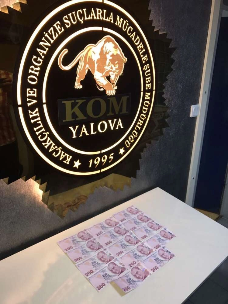 Yalova Emniyet Müdürlüğü KOM Şube piyasaya sahte para süren bir şüphelinin peşine düştü. Şahsın eşkalinden yola çıkan polis araştırmayı derinleştirdi. Şahsın daha önceden de bu yönde sabıkası olan S.S (20) olduğunu tespit eden KOM Şube ekipleri MOBESE kameralarının da yardımı ile şahsı kısa sürede yakalamayı başardı. Şahsın aracında ve üstünde yapılan aramada piyasaya sürülmek üzere bekletilen 14 adet 200 TL'lik sahte banknot ele geçirildi. Şahıs parada sahtecilik suçlaması ile sevk edildiği mahkemece tutuklanarak cezaevine kondu.