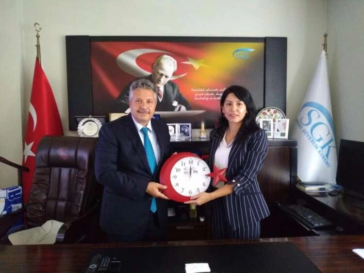 PTT Yalova Başmüdürü Elif Tan ziyaretlerin anısına Yalova SGK Müdürü Mehmet Salih Aydın ve Yalova Müftüsü Turgut Açari’ye PTT saati hediye etti.