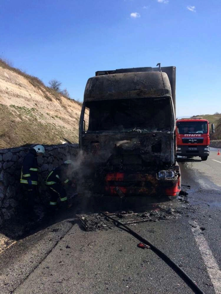34 Plakalı bir TIR Yalova'nın süpürgelik mevkiinde yanmaya başladı. Sürücü kısa sürede aracı saran alevlerden canını zor kurtardı. Yol kenarına çektiği araçtan atlayarak durumu itfaiyeye bildiren araç sürücüsü aracının yanışını üzüntülü gözlerle izledi. Kısa sürede aracın yanına gelen Yalova İtfaiyesi ekipleri alevlere müdahale ettiler. Yaklaşık 10 dakikada söndürülen araç adeta hurdaya döndü. Yangının araçta meydana gelen bir elektrik arızasından çıktığı düşünülüyor. TIR'ın Bursa'dan yüklediği malzemeleri İstanbul'a götürdüğü öğrenildi. Olayla ilgili tahkikat sürüyor.