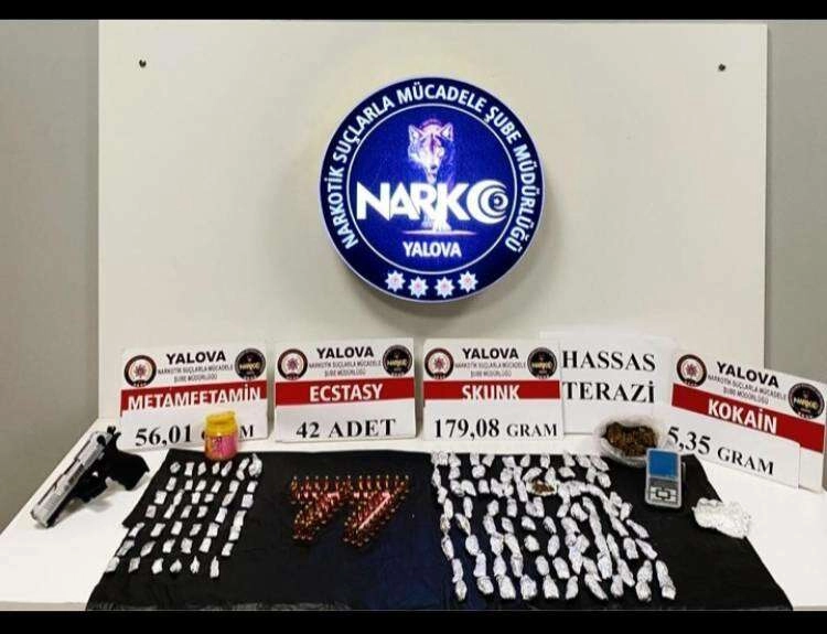 Şüphelilerin içinde bulundukları araçlar, Altınova-Yalova Kara Yolu üzerinde durduruldu. Araçlarda yapılan aramalarda 340 gram sentetik kannabinoid maddesi, 180 gram skunk maddesi, 56 gram metamfetamin maddesi, 42 adet ecstasy sentetik hap, 5.35 gram kokain maddesi, 1 adet hassas terazi, 1 adet ruhsatsız tabanca ve 56 adet tabanca mermisi ele geçirildi.