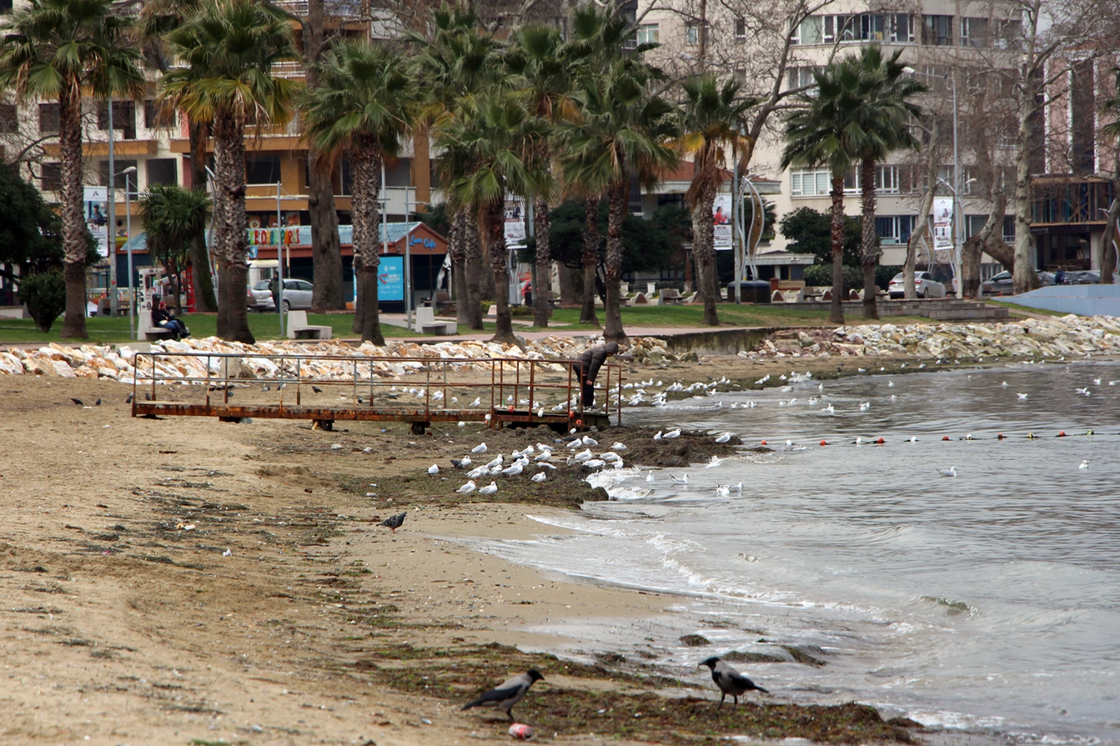 Deniz sularının çekilmesi nedeni ile kum tepeleri su üzerine çıkarken engelli bireyler için yapılan ve denizin içerisine kadar uzanan iskele ise açıkta kaldı.