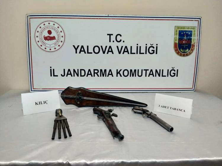 Yalova Jandarma Komutanlığı bir şahsın elinde bulunan tarihi eserleri satacağı yönünde aldığı istihbari bilgi sonrasında çalışmalara başladı. Teknik ve fiziki takip sonrasında gerekli bilgilere ulaşan jandarma ekipleri ardından düğmeye bastı. Yalova’nın Çiftlikköy İlçesi’ne bağlı Taşköprü beldesinde bir eve gece saatlerinde operasyon düzenlendi. Evde yakalanan S.Y adlı şüphelinin evinin önünde park halinde duran aracında yapılan aramada ise tarihi olduğu belirlenen 3 adet tabanca ve 1 adet kılıç ele geçirildi. S.Y gözaltına alınarak sorgulanmak üzere Jandarma Komutanlığı’na götürülürken, el konan tarihi eserlerin tarihinin belirlenmesi için ilgili kurumlara gönderildi. Olayla ilgili tahkikat devam ediyor.