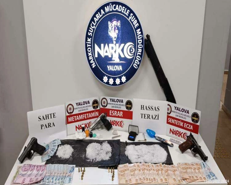 Yalova Emniyet Müdürlüğü Narkotik Suçlarla Mücadele Şube Müdürlüğü ekipleri aldıkları bir istihbarat üzerine harekete geçti. İstanbul’dan bir araçla Yalova’ya getirileceği ve burada torbacı tabir edilen sokak satıcıları vasıtası ile vatandaşlara satılacağı bilgisini alan ekipler gerekli planlamaları yaparak operasyon için düğmeye bastılar. Yapılan teknik takipte 77 plakalı bir araç tespit edilerek, durduruldu. Araç içerisindeki bulunan Y.Ö. Ö.G ve B.D. isimli şahıslar gözaltına alınırken araç içerisinde yapılan aramada ise 420 Gram Metamfetamin Maddesi, 1.19 Gram Sentetik Kannabinoid Maddesi, 0.61Gram Esrar Maddesi, 5 Adet Sentetik Ecza Grubu Tablet Hap, 2 Adet 9.00 mm. Çapında Tabanca, 1 Adet 7.65 mm. Çapında Tabanca, 1 Adet Tüfek, 3 Adet Hassas Terazi ve 2 bin 600 TL sahte para, Ele geçirildi. Ele geçirilen uyuşturucu ve silahlara el konulurken, şahıslar sorguları sonrasında Uyuşturucu Madde Ticareti Yapmak, 6136 Sayılı Ateşli silahlar ve bıçaklar hakkındaki Kanuna Muhalefet Suçu ve 5237 Sayılı Türk Ceza Kanunu 197. Maddesi Parada Sahtecilik Suçlaması ile adliyeye sevk edildiler. Hakim karşısına çıkartılan 3 şahıs tutuklanarak cezaevine gönderildi.