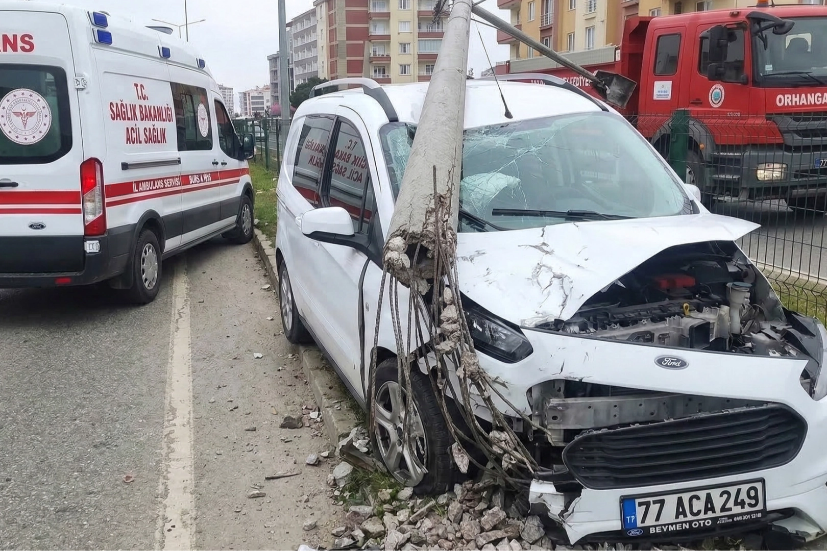 Kaza anında yaşanan şiddetli çarpışma nedeniyle yerinden sökülen aydınlatma direği, büyük bir gürültüyle aracın tavan kısmına devrildi. Metal yığınına dönen hafif ticari araçta bulunan 19 yaşındaki sürücü E.Y. ve yanında yolcu konumunda bulunan 18 yaşındaki arkadaşı A.G. araç içerisinde sıkıştı. Kazayı gören diğer sürücülerin ihbarı üzerine olay yerine hızla sağlık ve polis ekipleri sevk edildi.