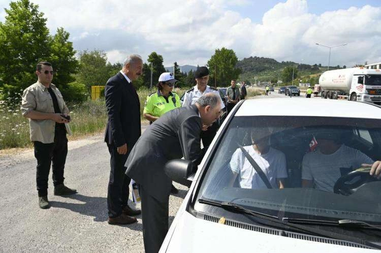 Yerden ve havadan Drone ile denetlenen yollarda kontrol noktaları da oluşturuldu. Bu denetimlere katılan Yalova Valisi Muammer Erol sürücülere emniyet kemeri uyarısında bulurken araçlarda bulunan çocuklara da hediyeler verdi. 9 Günlük bayram tatili için yollara düşen tatilciler yollarda yoğunluk oluşturuyor. Bu kapsamda şehirlerarası yollarda da trafik denetimleri sıklaştırıldı. Oluşturulan denetim noktalarında araçlar havadan Drone ile denetleniyor. Oluşturulan kontrol noktalarında ise araçlar durdurularak sürücülere uyarılarda bulunuluyor. Yalova-Bursa Yolu üzerinde oluşturulan kontrol noktasında gerçekleştirilen denetime Yalova Valisi Muammer Erol, Yalova Emniyet Müdürü Göksel Topaloğlu ve Yalova Jandarma Komutanı Mustafa Bakçepınar da katıldılar. Durdurulan araçların şoförlerine kazasız belasız bir yolculuk temennisinde bulunan Yalova Valisi Erol yolculuk boyunca emniyet kemeri takılması uyarısında da bulundu. Araçlarda bulunan çocuklara da yastık ve emniyet kemeri kılıfı hediye eden Vali Erol sürücülerle keyifli bir sohbet gerçekleştirmeyi de ihmal etmedi.