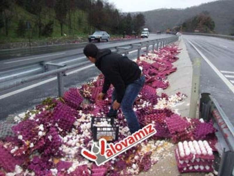 Yalova'dan aldığı yumurtaları Bursa'ya getirmek isteyen ve plakası alınamayan kamyon sürücüsü, Yalova-Bursa yolunda direksiyon hakimiyetini kaybederek yan yattı. Devrilerek trafiği aksatan kamyon sabah saatlerinde olay yerinden çekici yardımı ile kaldırıldı. Devrilen kamyonun olay yerinden ayrılmasının ardından yolun ortasına dökülen binlerce koli yumurtayı gören sürücüler durarak, yumurtaları almak için birbirleriyle yarıştı. Kırılan yumurtaların arasından sağlam olanları seçen vatandaşlar, topladıkları yumurtaları arabalarına koydu. Yoldan geçen bir Mercedes sürücüsü de yumurta topladı. Bedava yumurtayı gören sürücü, kolilerce sağlam yumurtayı alarak yoluna devam etti.Yolun her iki tarafına dökülen yumurtalar ise yolda ilginç görüntüler oluşturdu.