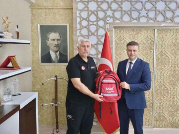 AFAD Müdürü Doğan Tonçer ziyaretinin anısına Yalova Milli Eğitim Müdürü Halil İbrahim Akmeşe’ye bir AFAD acil durum çantası hediye etti.