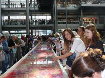 ‘Dünya Ebru Günü’, 8 Eylül 2012 tarihinde Türkiye’nin ve dünyanın çeşitli ülkelerinden sanatçıların, akademisyenlerin ve sanatseverlerin katılımıyla Pelican Mall Alışveriş ve Yaşam Merkezi’nde kutlandı. Bu yıl dünyada ilk kez düzenlenen ‘Dünya Ebru Günü’ organizasyonu kapsamında dünyanın en büyük Ebru çalışması yapıldı ve çalışma Guinness Rekorlar kitabına girdi. Guinness rekoruna katılan Ebru Sanatçıları ve yüzlerce gönüllünün katılımıyla yapılan denemede dünyanın en büyük Ebru çalışması yapıldı. Ebru Sanatçıları ve Gönüllüler 42 metrelik Ebru teknesinde hazırladıkları ebru figürlerini yaptı ve yüzlerce kişinin eseri tek bir ipek yüzeye alındı. 1000 yıllık sanatın doğum günü de olan Dünya Ebru Günü, çeşitli etkinliklerle 16 Eylül 2012 tarihine kadar sürecek. Etkinlikte sanatseverlerin en çok ilgisini çekecek diğer bir konu da ‘Ustalar Ebru Sergisi’ olacak. Sergi, bir ay boyunca sanatseverlerin beğenisine sunulacak. Aynı zamanda eserleri satın alma şansı da olacak. Yapılacak olan dünyanın en büyük ebrusunun satışından elde edilecek tüm gelir ihtiyaç sahibi bir kuruma bağışlanacak. 42 metrelik Ebru çalışması, Ebru Sanatçılarının karma Ebru sergisi ve çeşitli etkinlikler 08 – 16 Eylül 2012 tarihleri arasında İstanbul Avcılar E 5 yolu üzerindeki Pelican Mall Alışveriş ve Yaşam Merkezinde ziyaretçilere açık olacak. Dünya Ebru Günü etkinliğine Yalova’dan Ebru Sanatçısı Suna Selma Koçal, Vildan Pirim ve Suna Koçal’ın öğrencileri de iştirak etti.