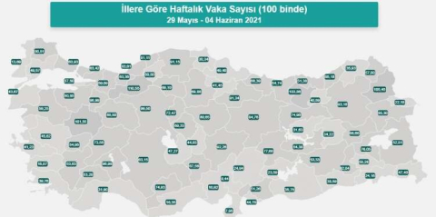 Haftalık verilere göre, Bolu, Kars, Gümüşhane, Kütahya ve Ankara 100 bin kişide en çok Kovid-19 vakası görülen iller arasında yer alırken, Hatay, Osmaniye, Adana, Edirne ve Mersin ise az Kovid-19 vakası görülen iller oldu.