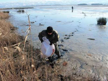 Altınova İlçesinde bulunan Hersek Lagününün kötü hava koşulları sebebiyle buz tutması üzerine beslenmekte zorlanan balık ve su kuşları için yem bırakıldı.