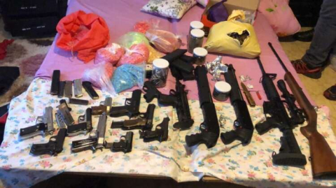 Çok sayıda silah ve mermi ele geçen evde uyuşturucu madde de bulundu.