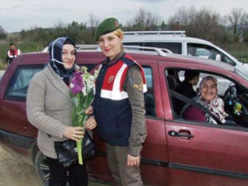 Çınarcık İlçe Jandarma Komutanlığı ekipleri, Koru Beldesi Nato Yolu sapağında yol üzerinde uygulama yaptı. Yolda uygulama yapan jandarma ekipleri, bayan sürücüleri ve erkek sürücülerin yanında bulunan eşlerine 8 Mart Dünya Kadınlar Gününü kutlayıp çiçek verdiler. Jandarma Trafik tarafından durdurulan sürücüler ehliyet ve ruhsatlarını hazırlayıp ekiplere uzatırken, jandarmada kendilerine uzatılan çiçekle şaşkına döndüler. Biran neye uğradığını şaşıran bayanlar,Jandarma ekiplerinin “Kadınlar Gününüz kutlu olsun” sözleri ile büyük mutluluk yaşadılar.