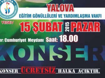 Yalova Eğitim Gönüllüleri Ve Yardımlaşma Vakfı sosyal sorumluluk projesi kapsamında 15 Şubat 2015 Pazar günü saat 18:00'de Cumhuriyet Meydanında Haluk Levent'in katılacağı bir konser düzenleyecek. Konuyla ilgili bir açıklama yapan Yalova Eğitim Gönüllüleri Ve Yardımlaşma Vakfı Kurucu Başkanı Fikret Demir, "Sosyal sorumluluk projemiz kapsamında düzenlenecek Haluk Levent Konserinde tüm halkımızı aramızda görmek istiyoruz" dedi.