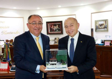 Yalova Belediye Başkanı Vefa Salman Limak Holding'in Yönetim Kurulu Başkanı Nihat Özdemir'e ziyaretinin anısına Yürüyen Köşk Maketi armağan etti.