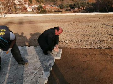 Esenköy Belediye Başkanı Mehmet Temel, yeni mezarlık için başlatılan yol yapım çalışmalarına bizzat katılarak işçilerle birlikte parke taş döşedi.